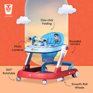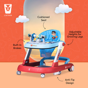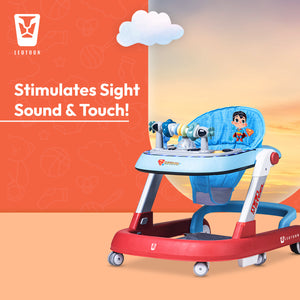 · Fun Superman Design: Leotoon presents a 2-in-1 Baby Walker with a Red & Blue combination featuring the Superman “S” Logo, a dining tray with interactive toys like a spinning Kryptonite orb and 10 seconds white music. The Superman aesthetic, with its bold Red & Blue colour scheme and iconic “S” logo is proudly displayed in Superman-themed baby walker. Bright, bold colours with Superman logo and Cape-inspired detailing make walking time super fun. Leotoon Licensed Superman 2-in-1 Baby Walker is made with Premium Quality Materials with Smooth Edges so that you have to never worry about your baby's Safety. It is beautifully decorated with Safest (Class 1) LED Multi-Colour Lights and fun toys.