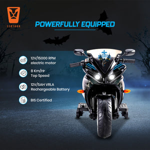 · Powerful Motor: Leotoon Batman Licensed Bike is equipped with a Powerful 12V/15000 RPM electric motor for Smooth and Steady Acceleration. Power Packed 12V/5AH VRLA Rechargeable Battery provides long-lasting power, allowing for extended playtime. With a top speed of 8 Km/Hr, it’s exciting yet safe for young riders.