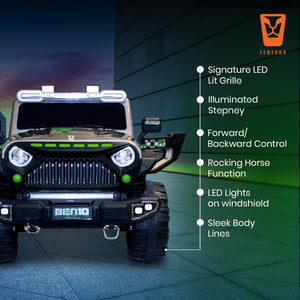 · Sturdy Construction: Leotoon Licensed BEN10 Terrain SUV is built with High-Quality, Durable Materials, ensuring a long-lasting ride. It’s Robust Frame is designed to handle bumps and rough terrain, providing Stability and Safety for young riders. It is made with Premium Quality Materials with Smooth Edges so that you have to never worry about your baby's Safety. This Ride-on SUV features Realistic Details, including Iconic BEN10 Badges, Omnitrix Cool Graphics, a Signature LED Lit Grille, and Sleek Body Lines, LED Lit Windshield & Illuminated Stepney giving kids the thrill of driving a real luxury vehicle.