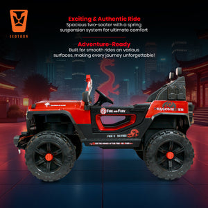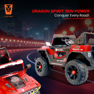 · Dragon-Themed Design: Leotoon Dragon SUV features Inspired by Dragon Culture, it features vibrant Red & Black colour Decals. It will make your child the envy of the neighbourhood and have an alter ego for every occasion. It offers an exciting and authentic riding experience. It features a Spacious Seat for Two Kids to sit and Spring Suspension System for a Smooth and Comfortable ride on various surfaces.
