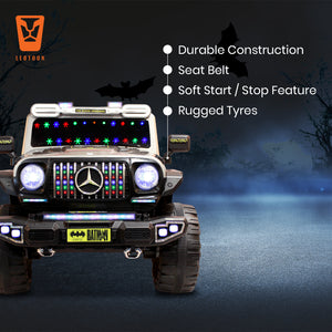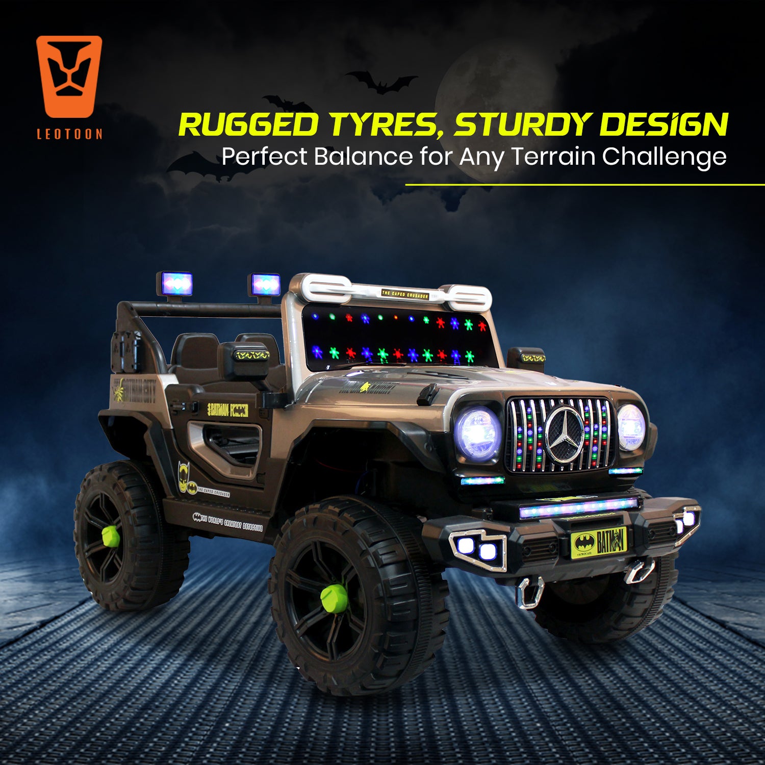 · Sturdy Construction: Leotoon Licensed Batman SUV is built with High-Quality, Durable Materials, ensuring a long-lasting ride. It’s Robust Frame is designed to handle bumps and rough terrain, providing Stability and Safety for young riders. It is made with Premium Quality Materials with Smooth Edges so that you have to never worry about your baby's Safety. This Ride-on SUV features Realistic Details, including Batman Decals, a Signature LED Lit Grille, and Sleek Body Lines, LED Lit Windshield & Illuminated Stepney giving kids the thrill of driving a real luxury vehicle.