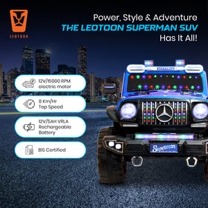 · Powerful Motor: Leotoon Licensed Superman SUV is equipped with Four Powerful 12V/16000 RPM electric motors for Smooth and Steady Acceleration. Two Power Packed 6V/5AH VRLA Rechargeable Batteries offers long-lasting playtime with speeds of up to 8 Km/Hr.