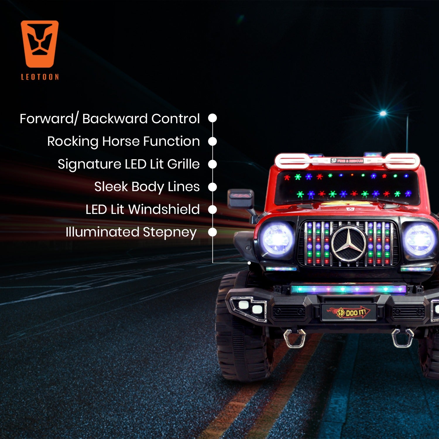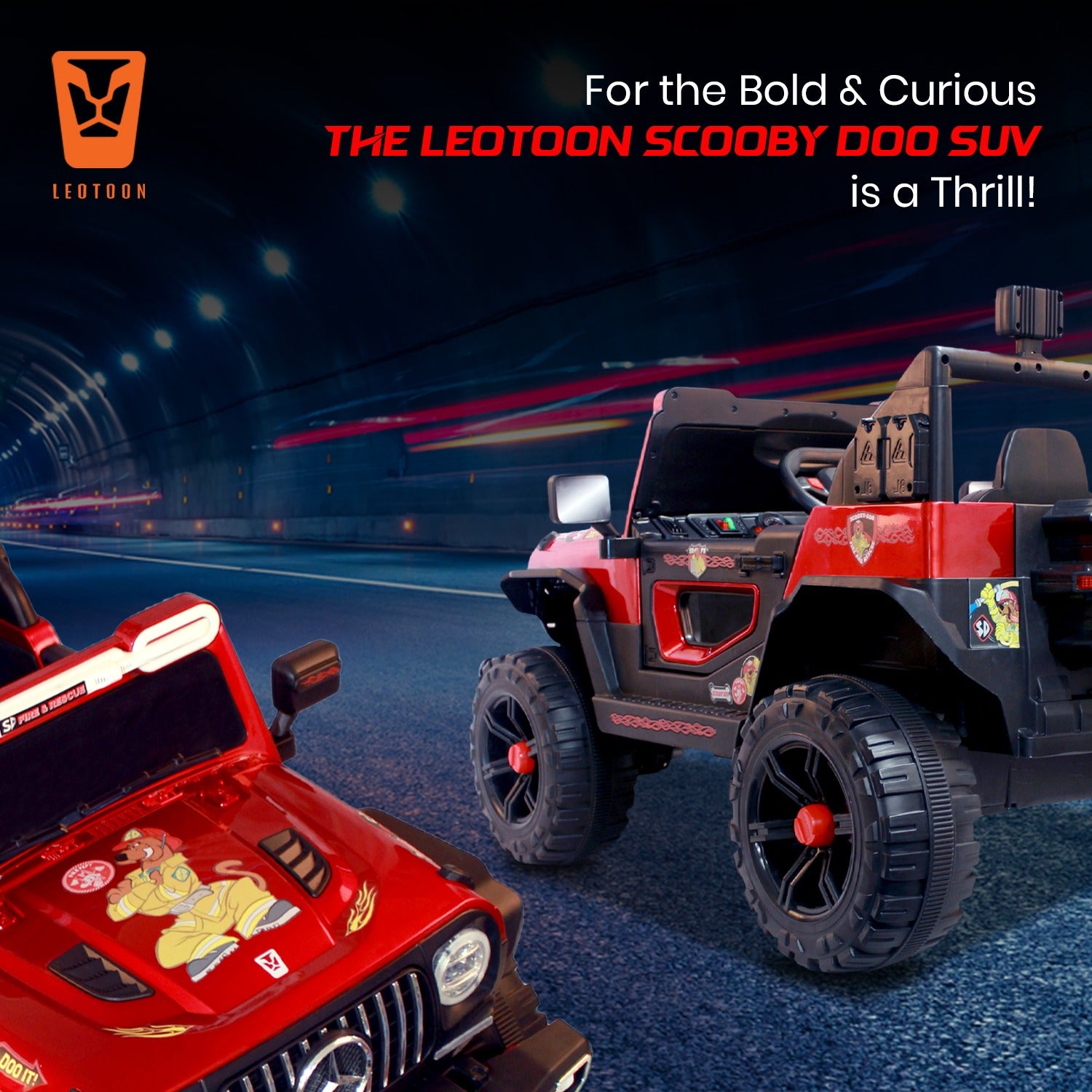 · Sturdy Construction: Leotoon Scooby Doo SUV is built with High-Quality, Durable Materials, ensuring a long-lasting ride. It’s Robust Frame is designed to handle bumps and rough terrain, providing Stability and Safety for young riders. It is made with Premium Quality Materials with Smooth Edges so that you have to never worry about your baby's Safety. This Ride-on SUV features Realistic Details, including Scooby Doo Decals, a Signature LED Lit Grille, and Sleek Body Lines, LED Lit Windshield & Illuminated Stepney giving kids the thrill of driving a real luxury vehicle.