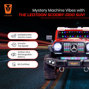 Leotoon Licensed Scooby Doo SUV | 2B 6V/5AH | 4M 12V/16000 RPM | 2.4 GHz Remote | USB/MP3 | 2 Seater | Rocking | Windshield Dancing LED | Bumper With LED | BIS Certified | (Metallic Red) (3-10 Years)