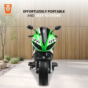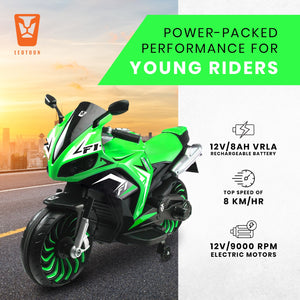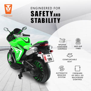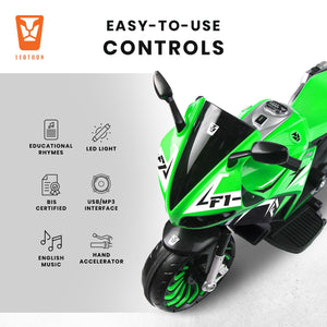 Leotoon Spudzilla Kids Bike | 12V/8AH Battery | 12V/9000 RPM 2 Motors | Hand Accelerator | USB/MP3 Interface | Educational Rhymes | LED Light | English Music | BIS Certified | (Green) (3-10 Years)