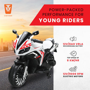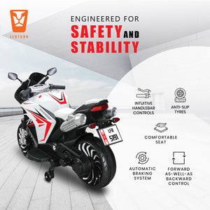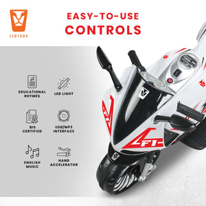 Leotoon Spudzilla Kids Bike | 12V/8AH Battery | 12V/9000 RPM 2 Motors | Hand Accelerator | USB/MP3 Interface | Educational Rhymes | LED Light | English Music | BIS Certified | (White) (3-10 Years)