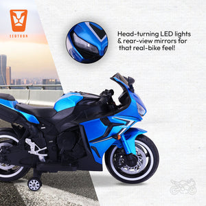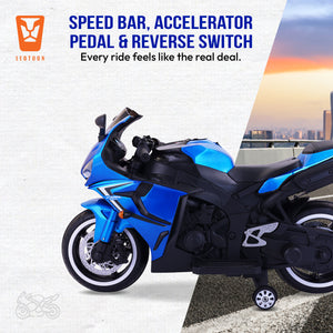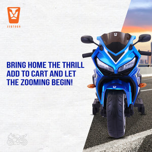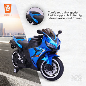 Leotoon Velvortex Bike | 12V/5AH Battery | 12V/15000 RPM Motor | Hand Accelerator | USB/MP3 Interface | Educational Rhymes | LED Light | English Music | BIS Certified | (Metallic Blue) (3-8 Years)
