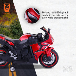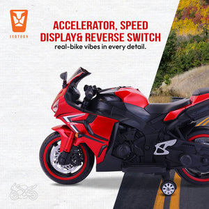 Leotoon Velvortex Bike | 12V/5AH Battery | 12V/15000 RPM Motor | Hand Accelerator | USB/MP3 Interface | Educational Rhymes | LED Light | English Music | BIS Certified | (Metallic Red) (3-8 Years)